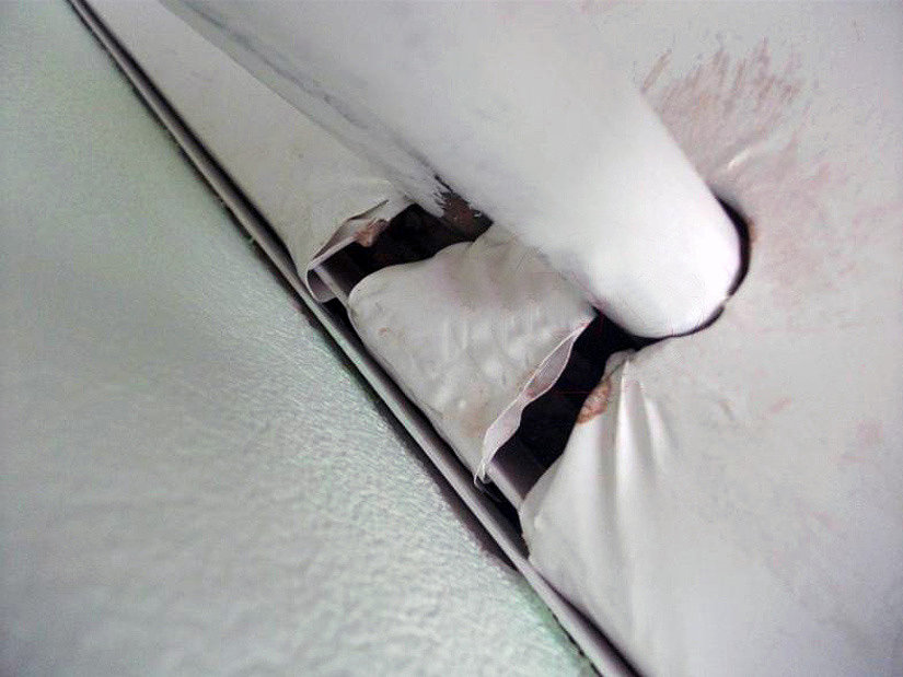 Эти дефекты обычно вызваны неквалифицированным монтажом светильников или неаккуратной эксплуатацией конструкции. На небольшие дефекты накладывают заплатки, для ремонта серьезных повреждений потребуется перетягивать полотно частично или полностью.