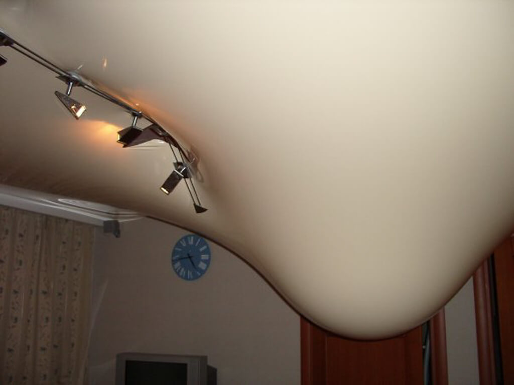 Натяжные потолки изготавливаются из негорючих материалов – ПВХ пленки или полиэстерового текстильного полотна. Однако при попадании искр, например, от бенгальских огней или неправильной установки светильников на нем появляются оплавления.